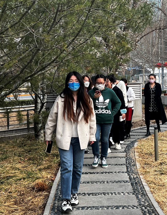 在春意盎然的景色下,参加健步走活动的员工们感受着春风的气息和温度,大家伸展手臂活动身体,享受着春天的美好,尽情地亲近大自然。从天创东门进入中关村广场公园西侧小花园漫步一圈下来大约15分钟的路程,不仅活动了身体,更愉悦了身心。
