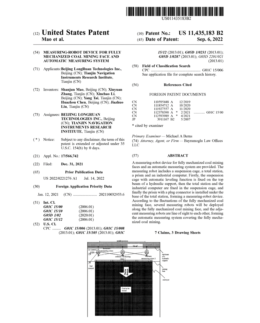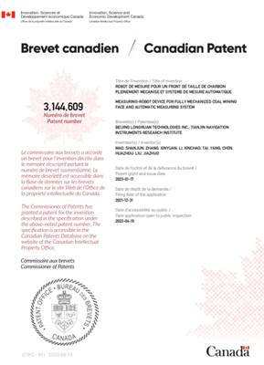 该发明于2021年5月获国内发明专利授权,2022年9月陆续获得国际授权,提出了一种综采工作面测量机器人装置和自动测量系统,测量机器人组成部分包括:吊笼、全站仪、棱镜、工控机。将具备自动整平功能的吊笼固定吊装在液压支架顶梁上,然后将全站仪、工控机固定在吊笼中,最后将带插接件的棱镜和全站仪底座对接,形成一个测量机器人装置。根据矿井综采工作面起伏,沿综采工作面依次布设多个测量机器人,且相邻的测量机器人通视,构成矿井覆盖综采工作面的自动测量系统。通过所述综采工作面测量机器人装置和自动测量系统实现了矿井综采工作面固定和移动目标的精确大地坐标测量。