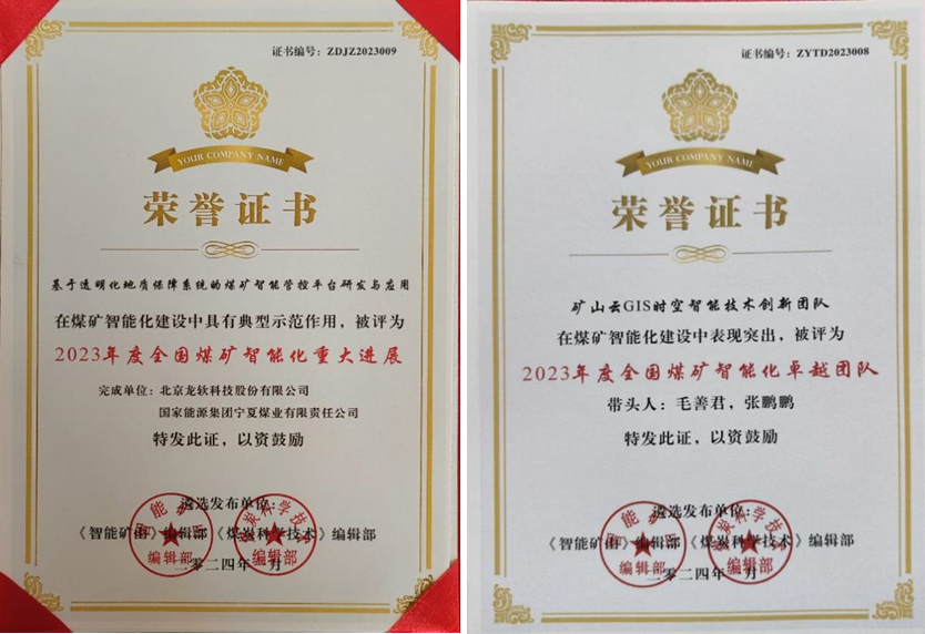龙软科技受邀参加会议并获得两项荣誉,其中“基于透明化地质保障系统的煤矿智能管控平台研发与应用”被评为2023年度全国煤矿智能化重大进展,“矿山云GIS时空智能技术创新团队”被评为2023年度全国煤矿智能化卓越团队。