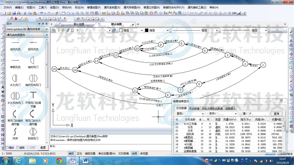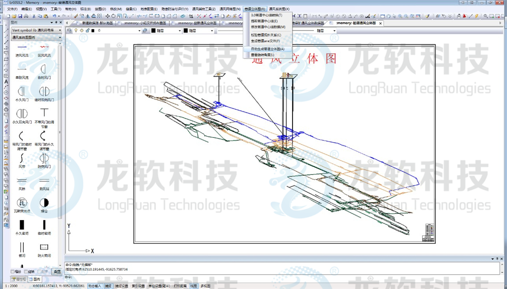 通防图形协同管理系统主要包括通风制图和通风系统仿真等模块。通风制图包括绘制通风系统图、避灾路线图、注浆系统图、瓦斯抽放系统图、瓦斯抽放曲线图、防尘系统图、防火系统图、监测监控系统图,自动生成通风系统立体图、通风网络图、通风系统压能图;通风系统仿真主要包括通风阻力测定数据的录入和处理,通风网络模拟解算,通风系统风量调节,风机优化选型等功能。