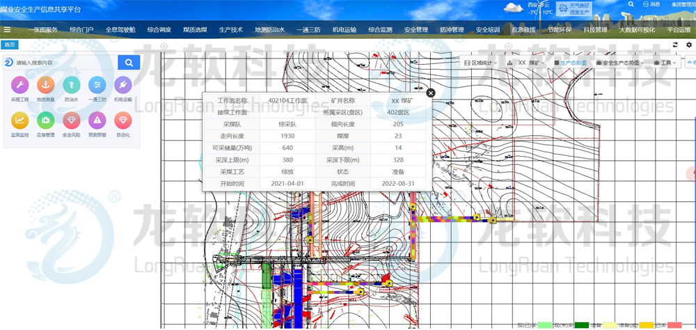 (3)基于“一张图”实现对煤矿生产调度、采煤掘进、一通三防、机电运输、地测防治水、资源储量、安全、培训、环保、科技、党建、企业文化、智能监控等业务数据的综合集成、可视化展示与智能化管理。