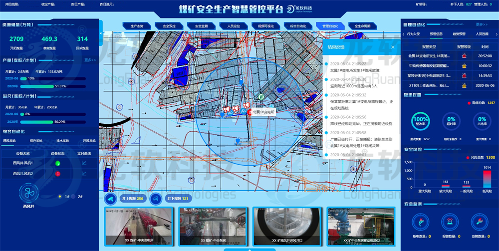 系统以LongRuan TGIS及LongRuan 4D-GIS平台为基础,依据“工业互联网+智慧矿山”绿色开采、高质量发展的运营技术路线,采用矿山多维GIS“一张图”管理理念,将煤矿“采、掘、机、运、通”等主要生产系统,以及井下环境安全、人员定位等实时系统进行融合,形成全面感知、实时互联、分析决策、自主学习、动态预测、协同控制的安全生产智能化管控平台,对井上下海量多源异构数据可视化展示、分析、挖掘和利用,实现矿井多部门、多专业、多管理层面的数据集中应用、交互共享和决策支持,实现各主要业务系统的智能操控与协同联动控制,服务于智能综采、综掘、通风、提升、运输等业务部门,为企业领导层正确决策提供科学依据,使领导和管理部门能够及时、全面、准确地掌握情况,实现对“地域、业务”的全覆盖,提升煤矿安全生产管理水平。