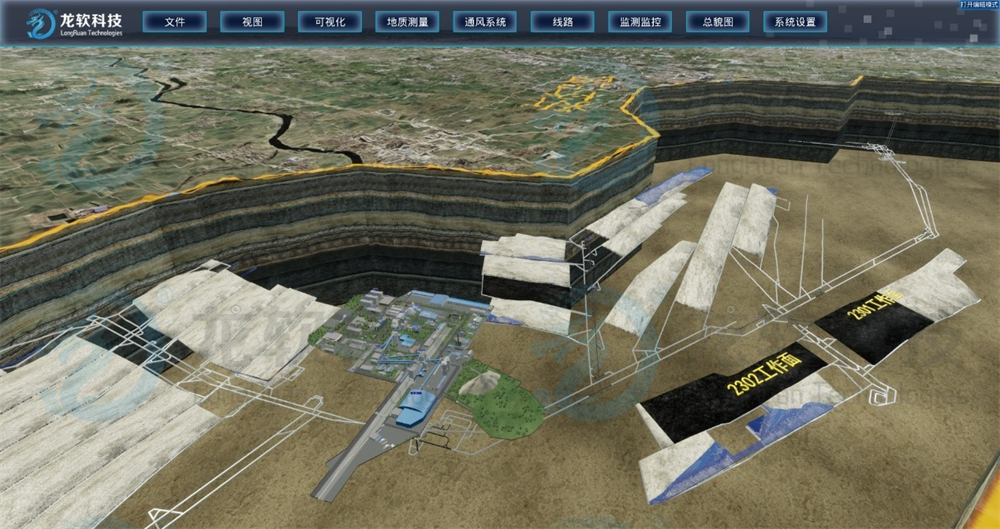 ( 6)地质大数据分析与隐蔽致灾预警报警分析和预警平台。基于龙软云平台,对煤矿地层、构造、煤层、煤质、瓦斯、水文和其它地质条件、地质特征及其变化规律进行可视化智能分析,实现隐蔽致灾因素(水害、瓦斯、冲击地压等)的预测预报,基于巷道、地层和生产的时空关系,进行危险源的远程可视化智能预警。