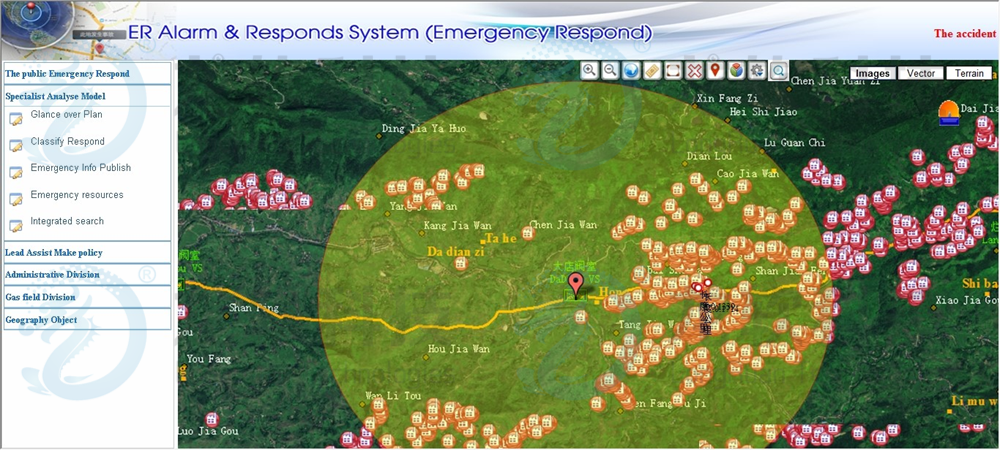 (1)海量数据可视化:支持矢量图、遥感影像地图、晕渲图、三维精细模型之间的动态切换,实现周边地理信息和应急资源的展示和动态调配。